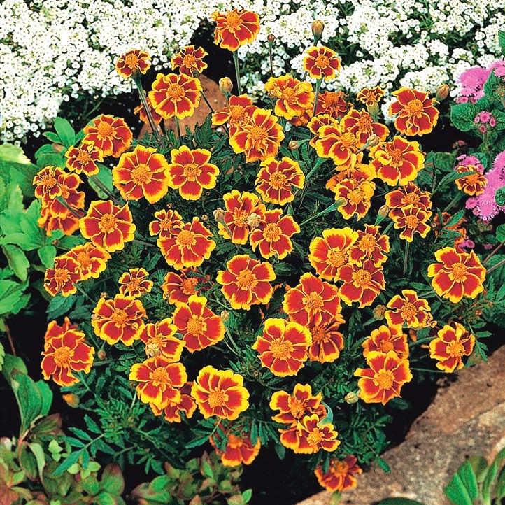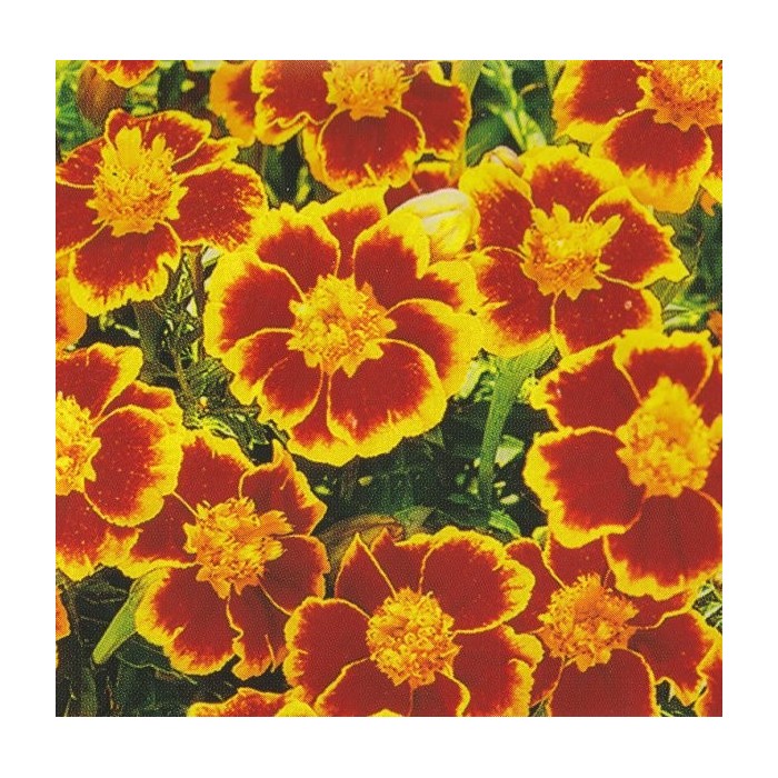 Семена бархатцев отклоненных Дейнти Мариет (Tagetes patula nana) всходят уже через 1-2 недели, при наличии температуры от плюс 20 градусов. Сеять бархатцы следует на светлом участке или в полутени, когда окончательно минует угроза любых заморозков. Компактный быстрорастущий сорт достигает 20 сантиметров в высоту. Хорошо кустится. Крупные и яркие соцветия засухоустойчивой культуры имеют немахровую текстуру. Лепестки цветков красного, кирпичного оттенка с желтой обводкой по окружности. Обильное и непрерывное цветение продлится до первых заморозков. Бархатцы Дейнти Мариет подходят для высадки в бордюрах, контейнерах и вазонах.