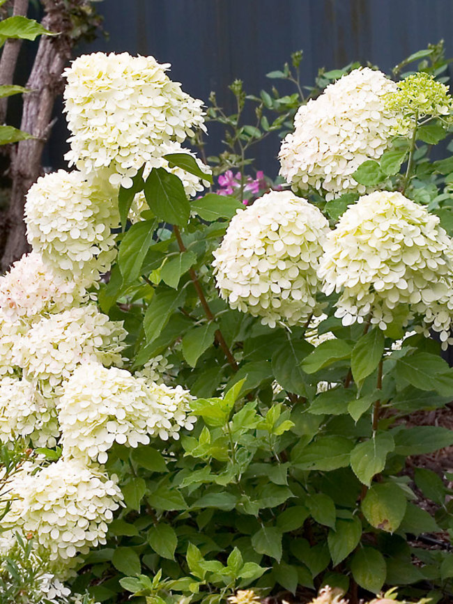 Саженцы гортензии метельчатой Литтл Лайм (Little Lime) относятся к очень декоративным растениям. Этот сорт отличается сильным цветением и маленьким ростом. Крупномер достигает в ширину и высоту не более 70 см. Побеги растения жесткие и прямостоячие. Листья зубчатые и большие. Соцветия гортензии метельчатой Little Lime собраны из мелких беловатых цветов с фисташковым оттенком в большие полушария. Цветы появляются в июле и держатся до октября, приобретая к концу розоватый оттенок.