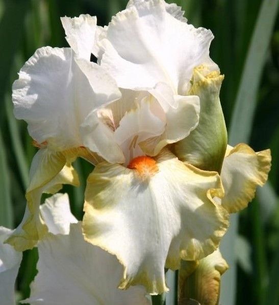 Ирис бородатый хэллоуин хало - это волшебное растение, которое поразит вас своей красотой и изысканностью. Сорт halloween halo привлекает внимание своими белыми цветками с бледно-жёлтой тонкой каймой на нижних лепестках, создавая неповторимый образ в вашем саду. Высота растения достигает до 90 см, что делает его заметным элементом в ландшафте. Листья ириса имеют элегантную форму, придающую растению особый шарм.