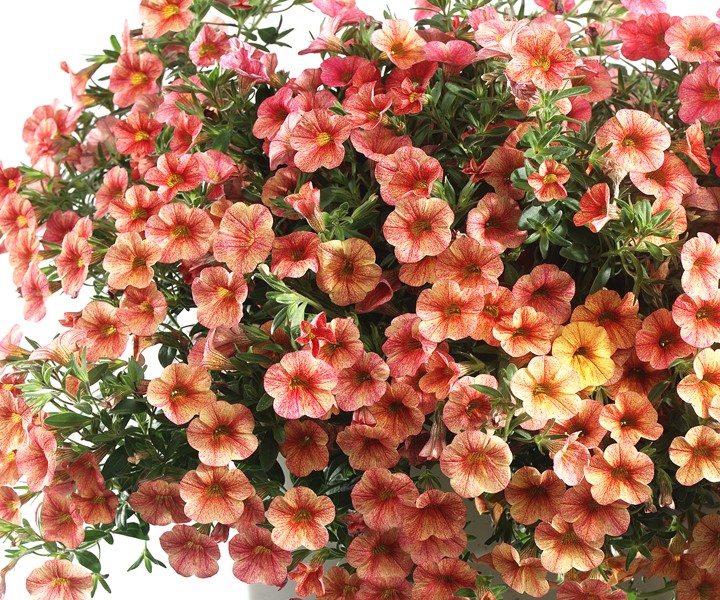 Саженцы калибрахоа Априкот (Calibrachoa Can-Can Rosies Apricot) украсят здание, балкон, беседку нежными пастельно-розовыми цветочками с ярко-рубиновой продольной прожилкой по центру каждого лепестка.