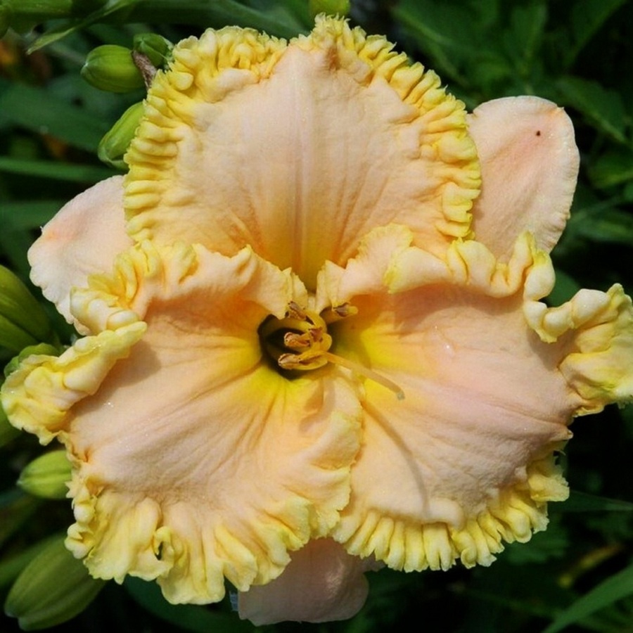Окраска цветка : Розово-персиковый с жёлтой гофрированной каймой