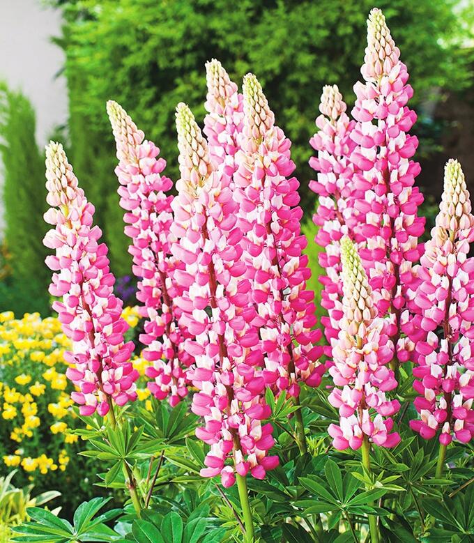 Семена люпина сорта Чателайн порадуют садоводов красивым цветением и простым уходом. В июне на растениях высотой около 120 см появляются пирамидально-колосовидные соцветия, состоящие из небольших цветков двойной розово-белой окраски. Семена люпина можно использовать для оформления различных садовых элементов:
