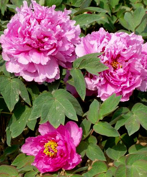 Саженцы пиона древовидного Блю Чиф (Paeonia Suffruticosa) подходят для групповых и одиночных посадок. Сорт морозостойкий, предпочитает расти на солнечных участках, защищенных от сквозняков. Высота растения до 1,2 метров. Листва насыщенного изумрудного цвета, розовые цветки на ее фоне выглядят еще красивее и роскошнее. Соцветия махровые, лепестки волнистые, плотно друг к другу прилегают. Цветки розового оттенка с голубоватым отливом. Диаметр соцветий – до 16 сантиметров. Бутоны распускаются в мае. Цветение обильное, весь куст усыпан шарообразными цветками. Период цветения длится около двух недель.