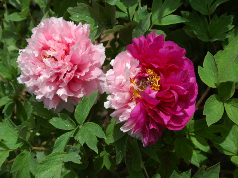 Саженцы пиона древовидного Сестры Киао (Paeonia Suffruticosa Hua er qiao) удивят даже опытных садоводов своей необычной окраской. Высота взрослого растения превышает 1,5 метра. Красивые листья ярко-зеленого цвета с темными прожилками, рифленые. Цветет в июне месяце на протяжении 3-4 недель. На каждом растении вырастает от 30 до 45 бутонов, которые распускаются друг за другом на протяжении всего периода цветения. Махровые пышные цветки средней величины, достигают 16 сантиметров. Желто-золотистая серединка цветка скрыта за волнистыми лепестками, которые плотно прилегают друг к другу. Цвет пиона очень удивительный - одна сторона - бело-розовая, другая - ярко-розовая, практически малиновая. Предпочитает хорошо дренированные почвы, удобренные фосфором и калийными удобрениями.