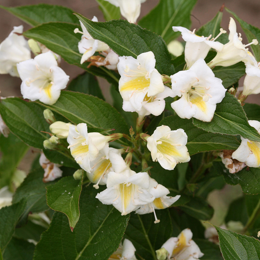 Саженцы Вейгелы цветущей SUNNY SIDE UP (Weigela florida) – щедро расцветает по весне большими белоснежными цветами, у которых ярко-желтая серединка. Листья кустарника темно-зеленые, красиво смотрятся в разное время года. Отличается удивительной устойчивостью, высотой и шириной обычно достигает до одного метра. Вейгела цветущей SUNNY SIDE UP любит плодородный влажный грунт и цветет почти повсюду. Обрезать кустарник лучше в июле и делать это рекомендуется ежегодно. Летом, когда заканчивается цветение, рекомендутся убирать пару старых стеблей в основании кустарника.