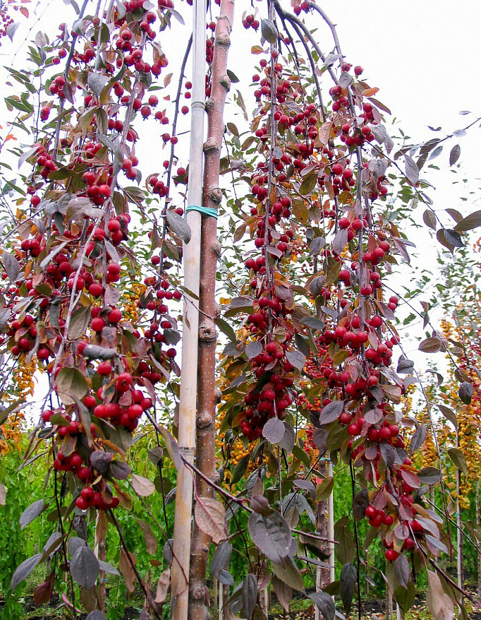Яблоня декоративная Роял Бьюти (штамб) представляют собой компактное дерево со свисающими вниз ветвями, на которых формируются красивые плоды, больше напоминающие ягоды. Растение сохраняет эффектный вид с ранней весны до поздней осени. Красные плоды не используют в пищу, зато они привлекают птиц и опыляющих насекомых. Деревья используют для оформления аллей, украшения придомовой территории и участков у беседки или скамейки. Интенсивность окраски листвы декоративной яблони зависит от уровня освещения. Для посадки подходит свежая почва с нейтральным или слегка кисловатым составом. Растение неприхотливо и не нуждается в сложном уходе.
